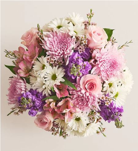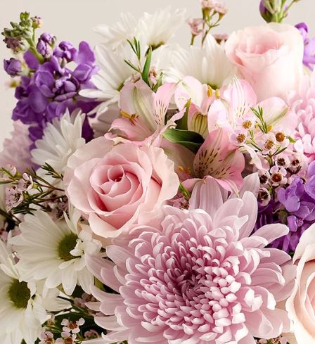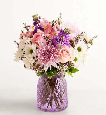 This premium floral arrangement is a lush, vibrant vase arrangement designed to celebrate the mothers in our lives. It features a soft and sophisticated pastel palette of pinks, purples, and whites, accented by deeper violet tones. Each piece is artfully arranged by our local, handpicked florists in Nashville, TN.