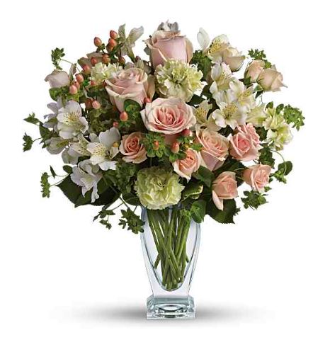 This is a premium hand-tied floral design presented in a clear tapered glass vase. The arrangement features a soft, romantic color palette of blush pink, cream, ivory, and light green tones with delicate red accents. Each piece is artfully arranged by our local, handpicked florists in Nashville, TN.
