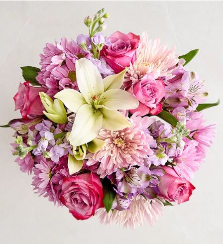 This premium floral arrangement is a lush, vibrant vase display featuring a sophisticated mix of pastel and bold tones. The general color palette consists of lavender, soft pink, magenta, and creamy white. Each piece is artfully arranged by our local, handpicked florists in Nashville, TN. 🌷
