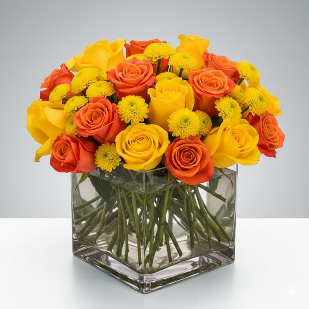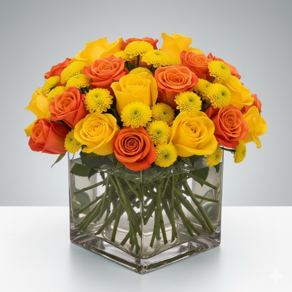 This is a vibrant vase arrangement featuring a dense, low-profile design presented in a modern clear glass cube. The general color palette is a warm, high-energy mix of bright yellow and deep orange, creating a bold “sunshine” aesthetic. Each piece is artfully arranged by our local, handpicked florists in Nashville, TN.