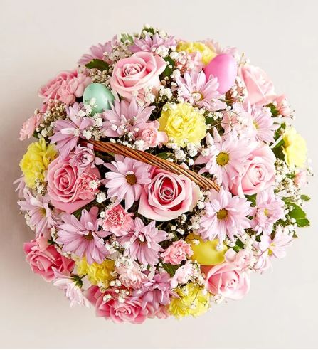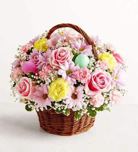 This festive arrangement features a dense, mounded display of pastel blooms gathered in a classic woven wicker basket. Designed specifically for the Nashville, TN area, the palette focuses on soft pinks, sunny yellows, and lavenders, accented with colorful decorative Easter eggs. Each piece is artfully arranged by our local, handpicked florists in Nashville, TN.