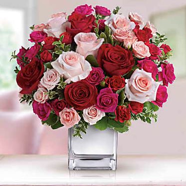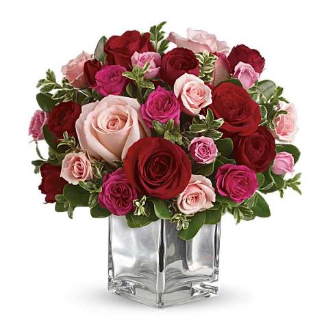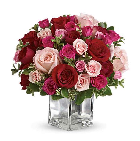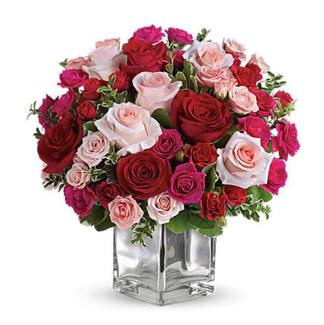 This is a rounded, hand-designed floral arrangement displayed in a clear glass cube vase. The color palette features shades of red, hot pink, and blush pink with white accents and green foliage throughout. Each piece is artfully arranged by our local, handpicked florists in Nashville, TN.