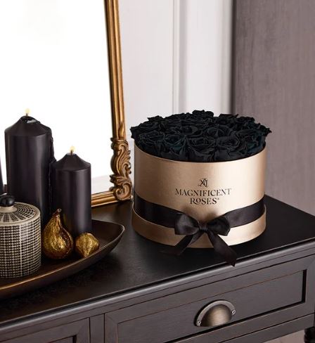 Deep black roses are typically tinted or preserved to achieve the color. Handle gently to avoid color transfer to hands.