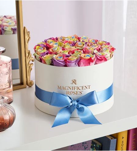 This is a premium preserved rose arrangement presented in a round hat box style container. The design features dozens of multicolored roses packed tightly in a dome shape, finished with a light blue satin ribbon. Arrangement type is box. General color palette is pastel rainbow: soft shades of pink, purple, yellow, green, and blue blended in each rose. Where it is arranged: Not specified on the product page. Each piece is artfully arranged by our local, handpicked florists in Nashville, TN.
