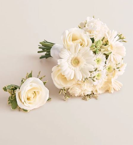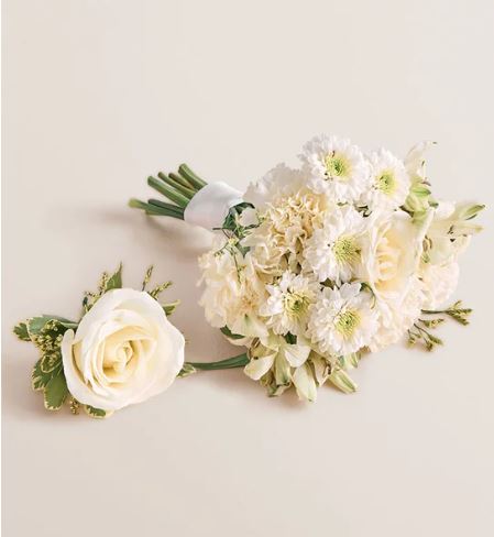 This is a bouquet and boutonniere set designed for formal events like prom or weddings. The arrangement type is a hand-tied bouquet paired with a matching boutonniere. The general color palette is all-white and ivory with soft green accents from the foliage. Each piece is artfully arranged by our local, handpicked florists in Nashville, TN.