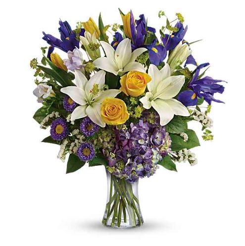 This is a premium spring-themed floral design arranged in a clear glass vase. The arrangement features a vibrant, balanced color palette of yellow, white, purple, and deep blue with fresh green stems visible. Each piece is artfully arranged by our local, handpicked florists in Nashville, TN.