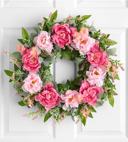 This is a round door wreath featuring full, layered blooms arranged on a vine or grapevine base. The general color palette includes shades of deep pink, soft blush pink, and peach with accents of green foliage. Each piece is artfully arranged by our local, handpicked florists in Nashville, TN.