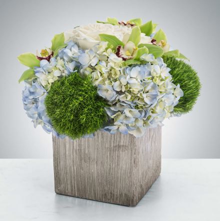 This elegant, round floral arrangement is a high-end vase display designed with a modern, compact aesthetic. It features a serene white, blue, and lime green color palette with deep burgundy accents. Each piece is artfully arranged by our local, handpicked florists in Nashville, TN.